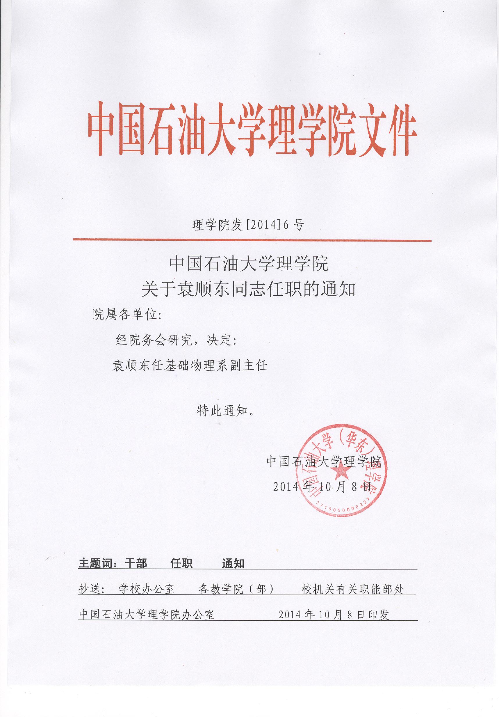 中国石油大学SUNBET申博关于袁顺东同志任职的通知