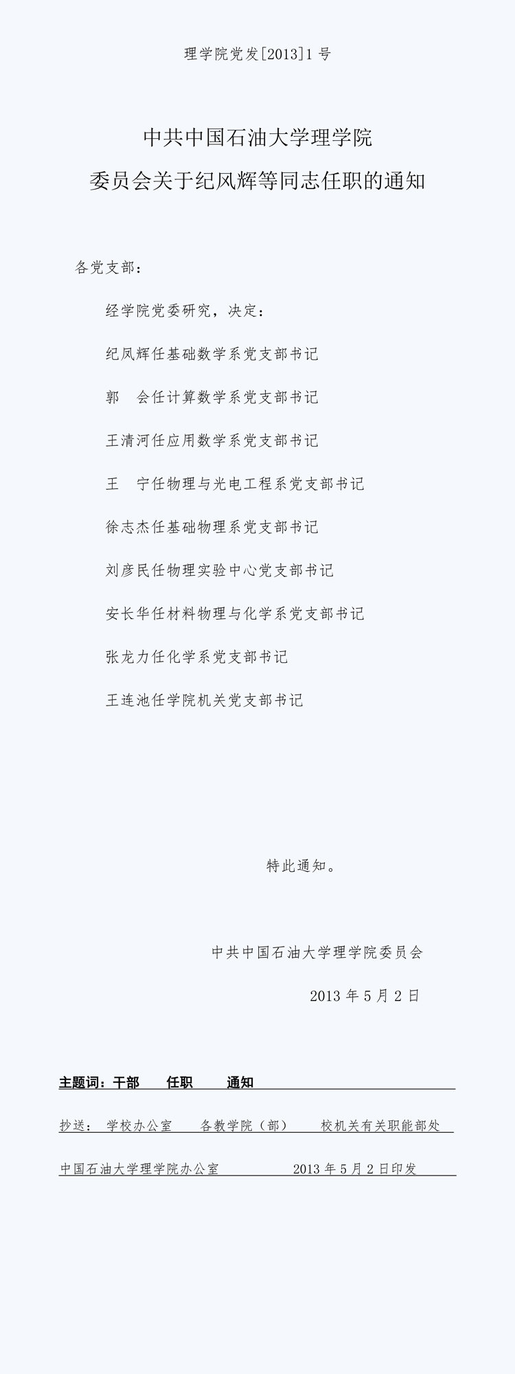 中共中国石油大学SUNBET申博委员会关于纪凤辉等同志任职的通知