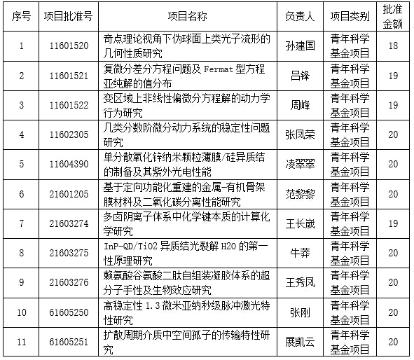近日,国家自然科学基金委员会公布了2016年度国家自然科学基金申请项目评审结果。公司获批11项国家自然科学基金-青年基金项目,见清单。