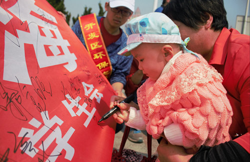 在绿化带和沙滩清洁的时候,景区广场的两个小组也开始了紧锣密鼓的工作,他们分别在两个沙滩景区入口广场处拉起横幅,呼吁大家在横幅上签下自己的环保承诺并向发放环保知识宣传手册,倡导大家共同营造“绿色”金沙滩。在李传奇小朋友签上名字后,母亲教育他说:“签上名字后就要记住以后要保护环境,不能乱丢垃圾。”二参与活动的广大游客纷纷表示将积极配合景区管理人员工作,自觉保护环境,不随手乱扔垃圾,减少环卫劳动者的工作量。