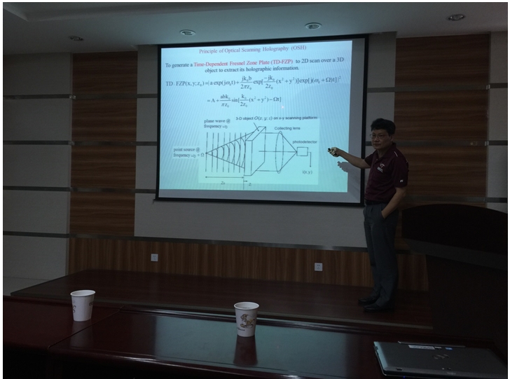2015年5月30日上午,来自美国弗吉尼亚理工大学的T.C. POON教授,在文理楼254报告厅举行了“光学扫描全息术的进展”的专题报告,报告由焦志勇教授主持。光学扫描全息术(OSH)是一个独特的数字全息技术。该技术利用二维活动的光学外差扫描实现三维(3-D)的实时全息物光记录。到目前为止,该技术的应用包括光学扫描加密,光学显微镜,三维模式识别,三维全息电视,和三维光学遥感。在演讲中,将首先提供一个扫描光学全息的概述,随后将评论最近的一些已经取得的进步,以及未来可能的应用和效益。 T.C. Poon教授,弗吉尼亚理工大学电气和计算机工程公司教授。目前的研究兴趣包括三维图像处理,和光学扫描全息术。是专著《光学扫描全息术与MATLAB》(Springer,2007),教材《现代数字全息与MATLAB导论》(剑桥大学出版社,2014),《利用MATLAB的工程光学》(世界科学2006),《用MATLAB的当代的光学图像处理》(Elsevier 2001),和《应用光学原理》(McGraw-Hill,1991)的作者。他也是《数字全息三维显示》(Springer 2006)的编辑者。并担任期刊国际光电子和光学工程客座编辑。Poon博士曾担任应用光学编辑,目前是《中国光学快报》副主编,和IEEE工业信息学副主编。他是美国光学学会(OSA)和OLT的主体编辑。Poon博士是OSA协会、SPIE、IOP的资深会员、IEEE高级会员。 (周伟) |