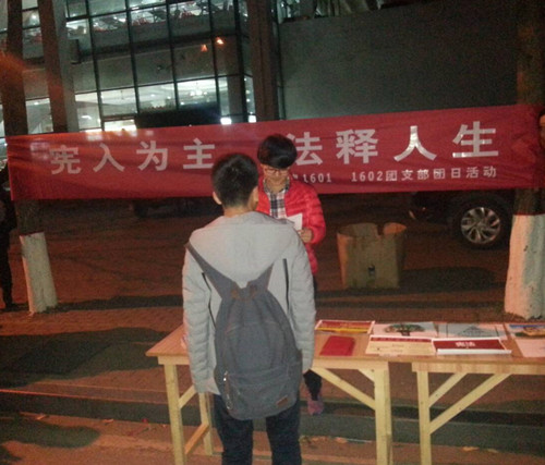 为了让同学们了解更多关于宪法的知识。2016年11月30日17时30分,信息1601、1602团支部在玉兰苑西门举办了“宪入为主,法释人生”为主题的团日活动。在学习宪法的过程中同学们共同进步,收获了许多