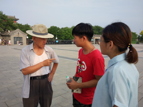 (当地老人向实践队员介绍卢沟桥历史 周小卉摄影)