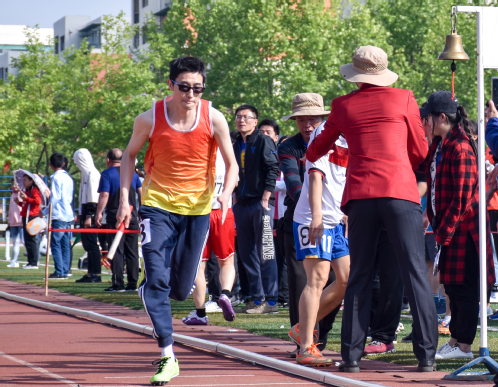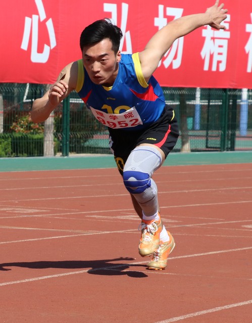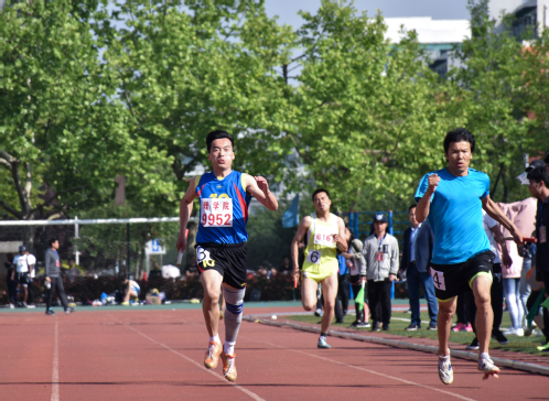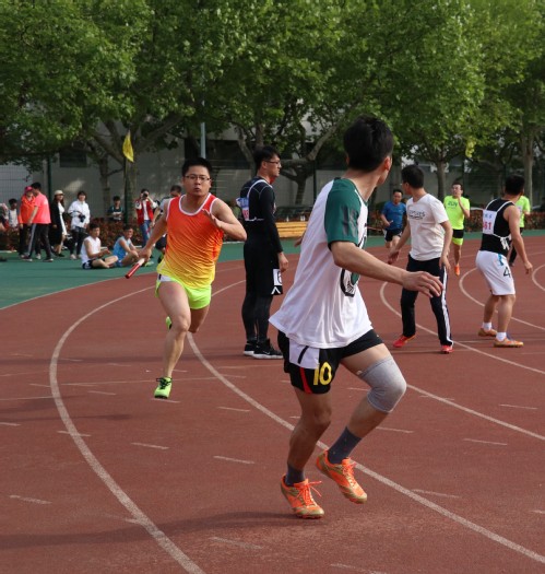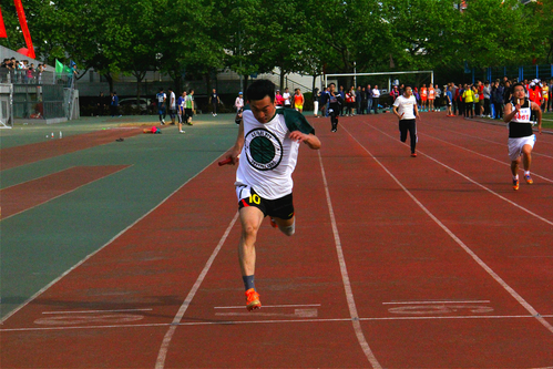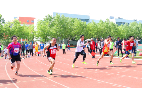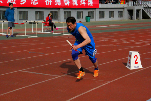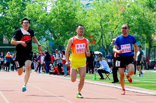 5月18日下午 SUNBET申博获得男教工丙组4×100接力第一名(刘威冲刺)