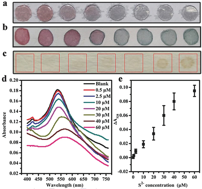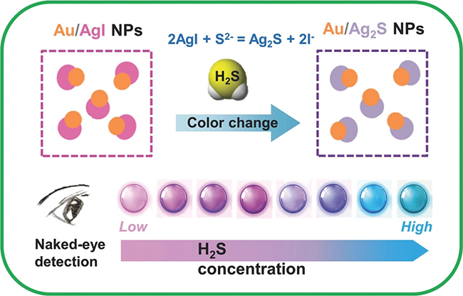 针对上述挑战,曾景斌课题组在国家自然科学基金和中央高校基本科研业务费专项资金项目的资助下,通过以Au纳米为种子,外延生长法制备Au@Ag核/壳纳米材料,进而利用碘单质的刻蚀&沉淀作用,制备了一种具有Au/AgI二聚体结构的纳米等离激元复合材料,利用探针中AgI壳很稳定却可以在H2S作用下转化为Ag2S的性质,引起纳米探针的局域表面等离子体共振吸收(LSPR)波长移动,进而形成裸眼可识别的光谱和颜色变化,构建了一种针对H2S气体的高选择性和高灵敏的比色传感探针;研究人员进一步将该纳米探针包埋于琼脂凝胶,克服了纳米探针在液相容易团聚的缺陷,提供了一种集H2S原位富集与定量检测一体化的试纸条,该试纸条不仅实现了对H2S的半定量检测,而且由于凝胶基质在可见光区透明,可进一步结合吸收光谱进行工作环境和细胞培养过程中H2S含量的定量测定。与商用醋酸铅试纸相比,该试纸条在灵敏度、选择性、稳定性和保真度方面具有很强的优越性。该工作不仅为H2S的快速可视化检测提供了新方法,而且为超高灵敏、特异性的纳米等离激元二聚体材料的设计和合成提供了新思路。