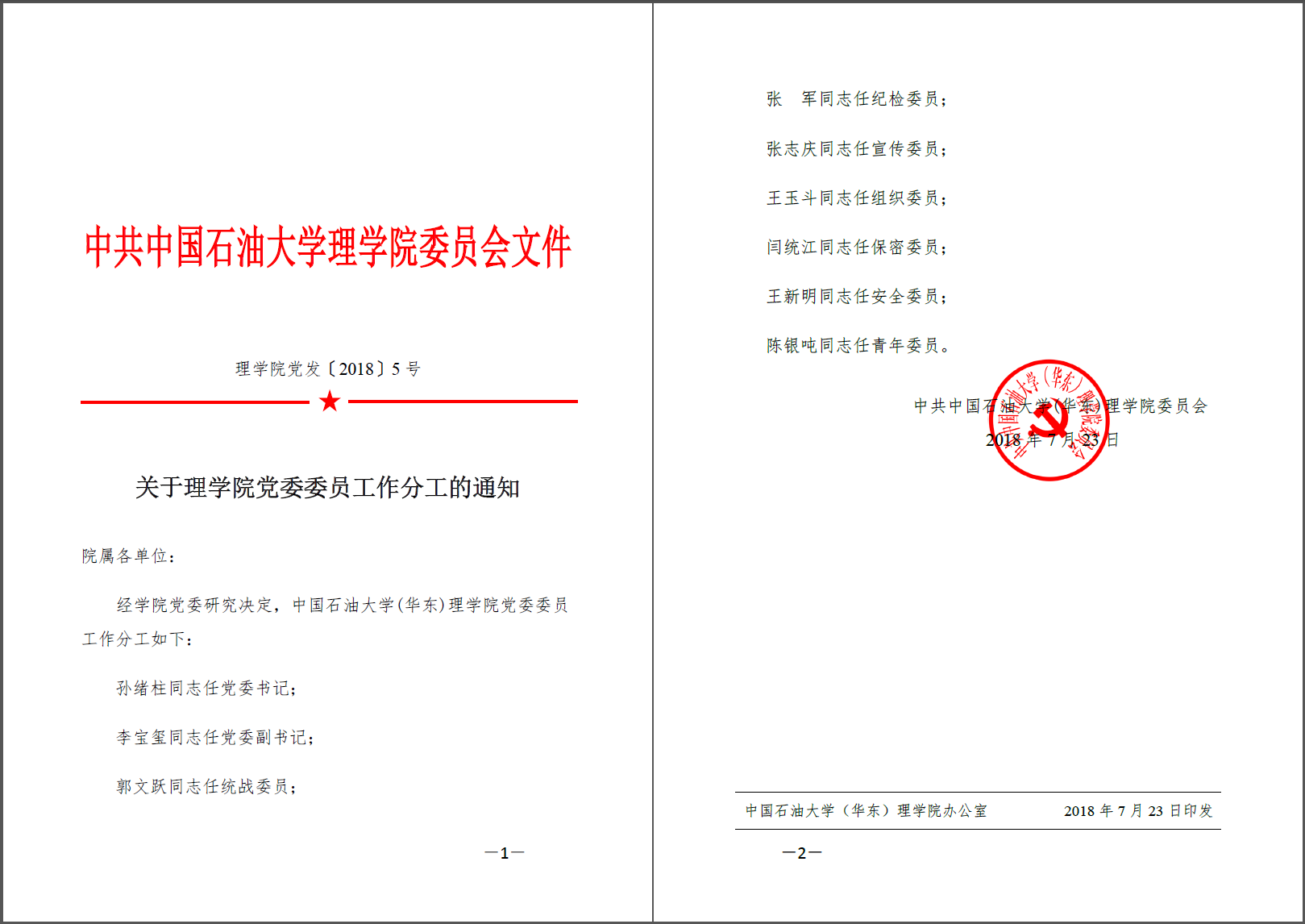 公司党发[2018]5号关于公司党委委员工作分工的通知