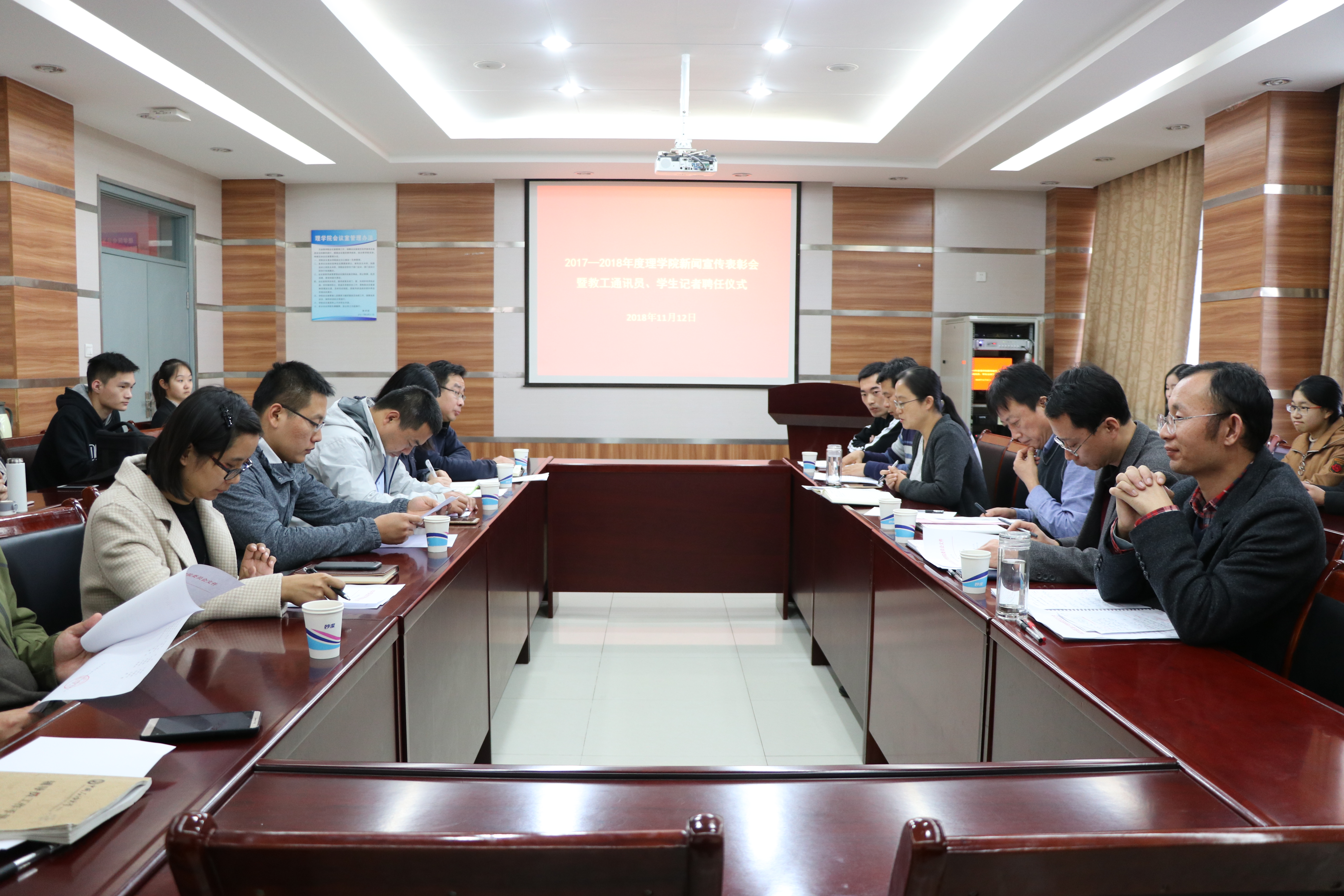11月12日下午,SUNBET申博在文理楼254室召开2017-2018年度新闻宣传表彰会暨教工通讯员、员工记者聘任仪式,表彰公司新闻宣传工作者在过去一年取得的突出成绩并聘任新的教工通讯员、员工记者。本次会议由公司党委副书记李宝玺主持,公司党委书记孙绪柱、公司党委宣传部副部长刘积舜受邀出席,全体教工通讯员、员工记者参加会议。