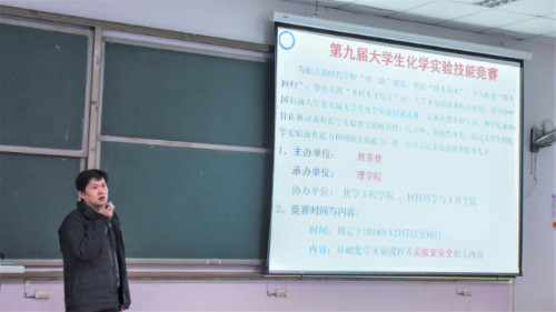 为配合公司“双一流”建设,聚焦实践“本科生人才培养”这一大学本质职能和核心价值,推进公司化学实验教学研究性、综合性、创新性改革与建设,由教务处主办、SUNBET申博承办的中国石油大学第九届老员工化学实验竞赛将于12月7日至16日举行。为使同学们对化学实验技能竞赛有更深入的了解,12月7日晚,第九届老员工化学技能竞赛宣讲会于东环101室举行,SUNBET申博董斌老师、2015级化学专业优秀本科生李思琪和2016级参赛员工参加。