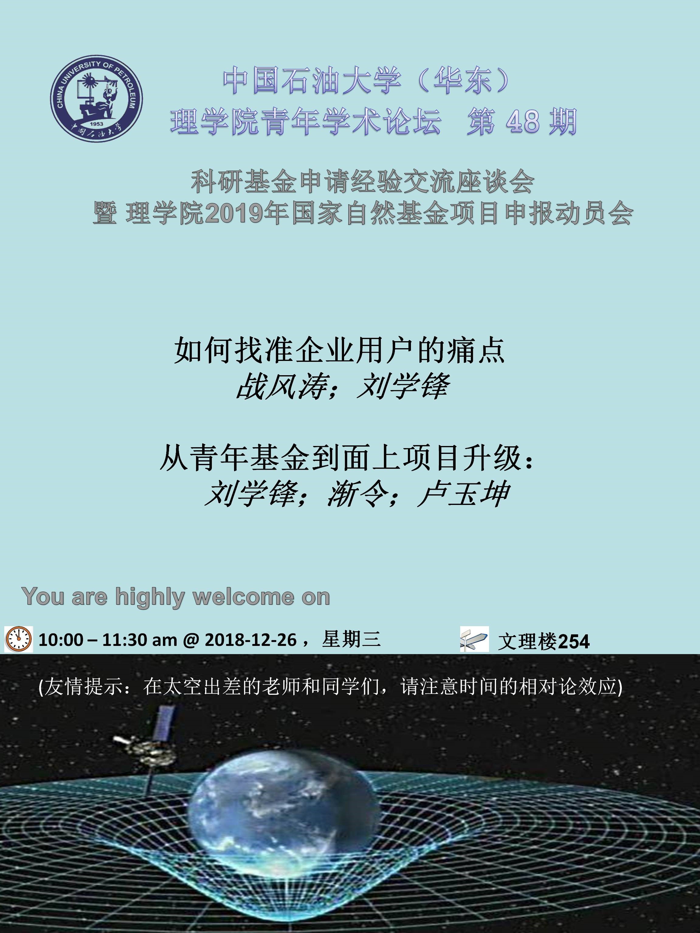 由于2019年度国家基金申请即将到来,按惯例咱们将举行国家自然基金申请经验交流会。本次咱们邀请刘学锋、渐令、卢玉坤三位专家给咱们分享新鲜热乎的面上基金获批经验分享。本次座谈会与科技处近期要求举办的国家自然基金项目申请动员会目的相同,因此合并举行。对于打算申请国家基金的老师和同学,欢迎届时参加座谈会。12月26日,周三,早上10:00-11:30,文理楼254,参见海报。