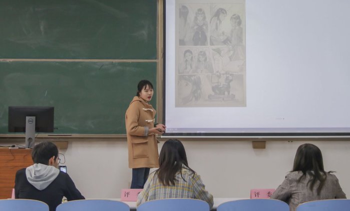 活动伊始,张静丽对此次活动进行简单说明,并介绍了三位受邀评委。接着,她简单讲解了评分标准,各个入围选手依次对自己的作品进行讲解。其中,行政1701班王瑞敏分别从创造理念、作品色调与形式等五个方面对自己的作品进行了详细的解说,并通过PPT将自己的创作过程以视频的形式进行了展示。她表示:“我已经在我的能力范围之内尽了全力了,对于这次活动的表现,我还是挺满意的。”答辩结束后,相关工作人员将评分进行计算并评选出奖项,由三位评委给获奖选手颁奖。最后,评委与获奖选手进行合影。