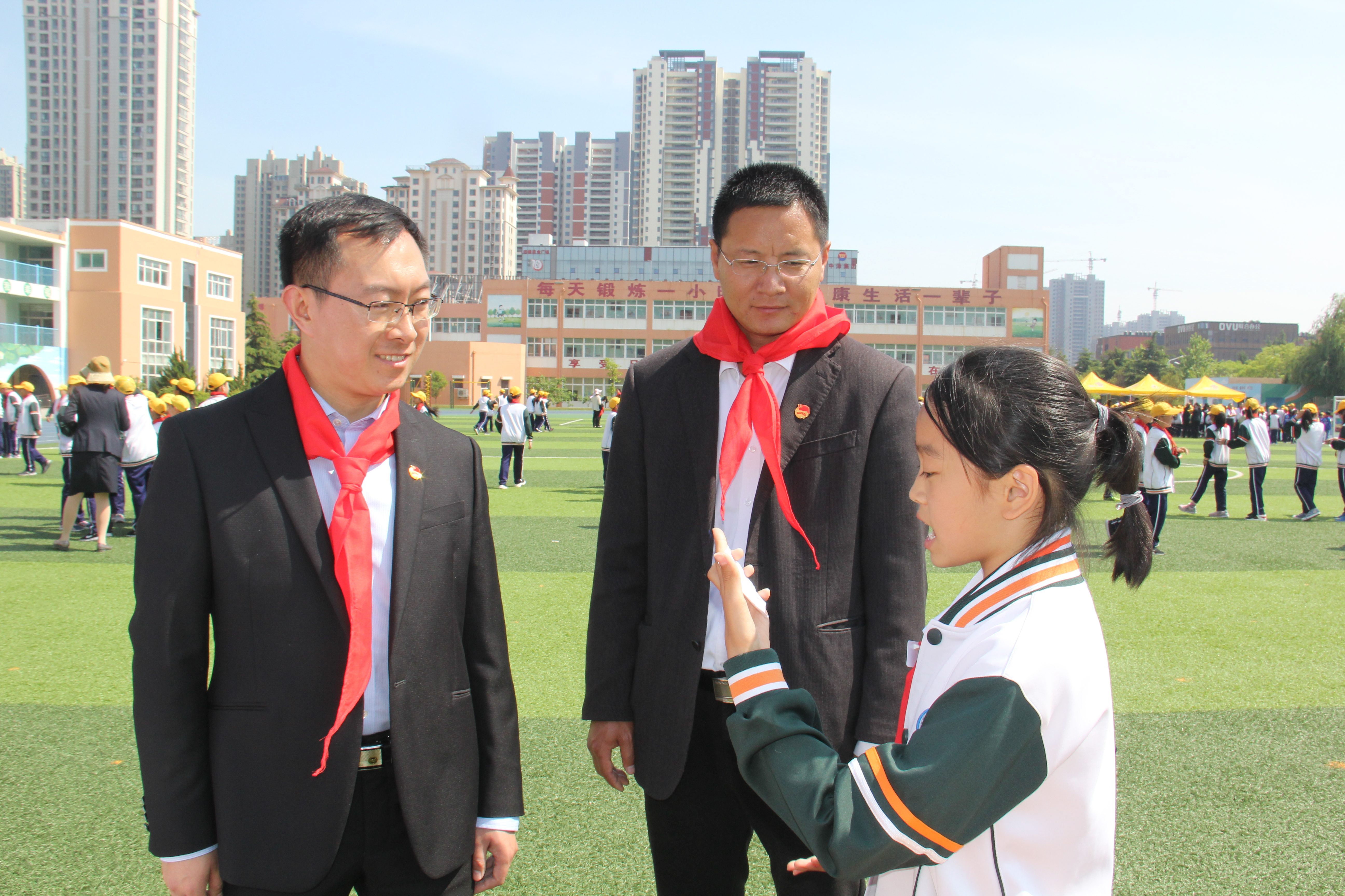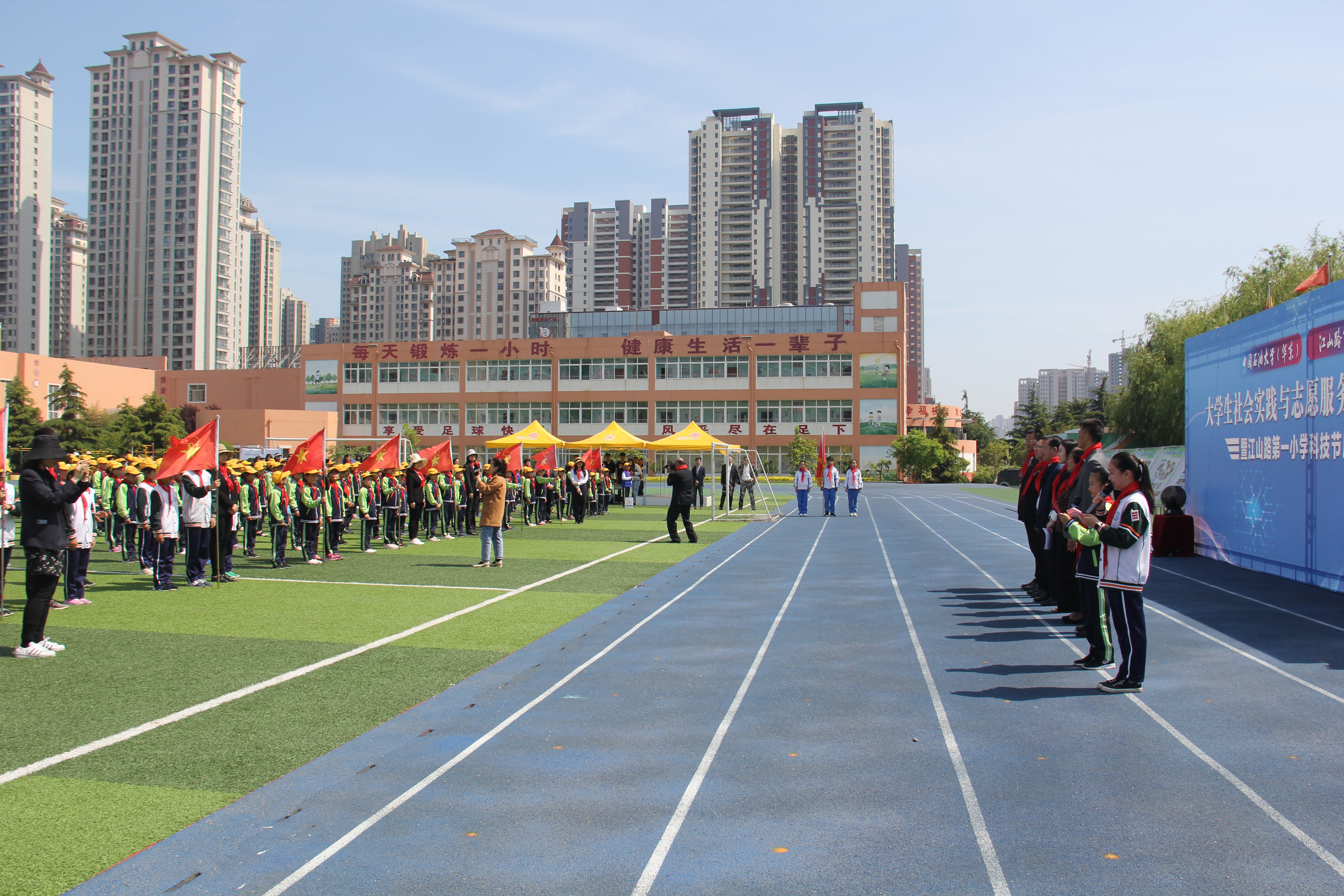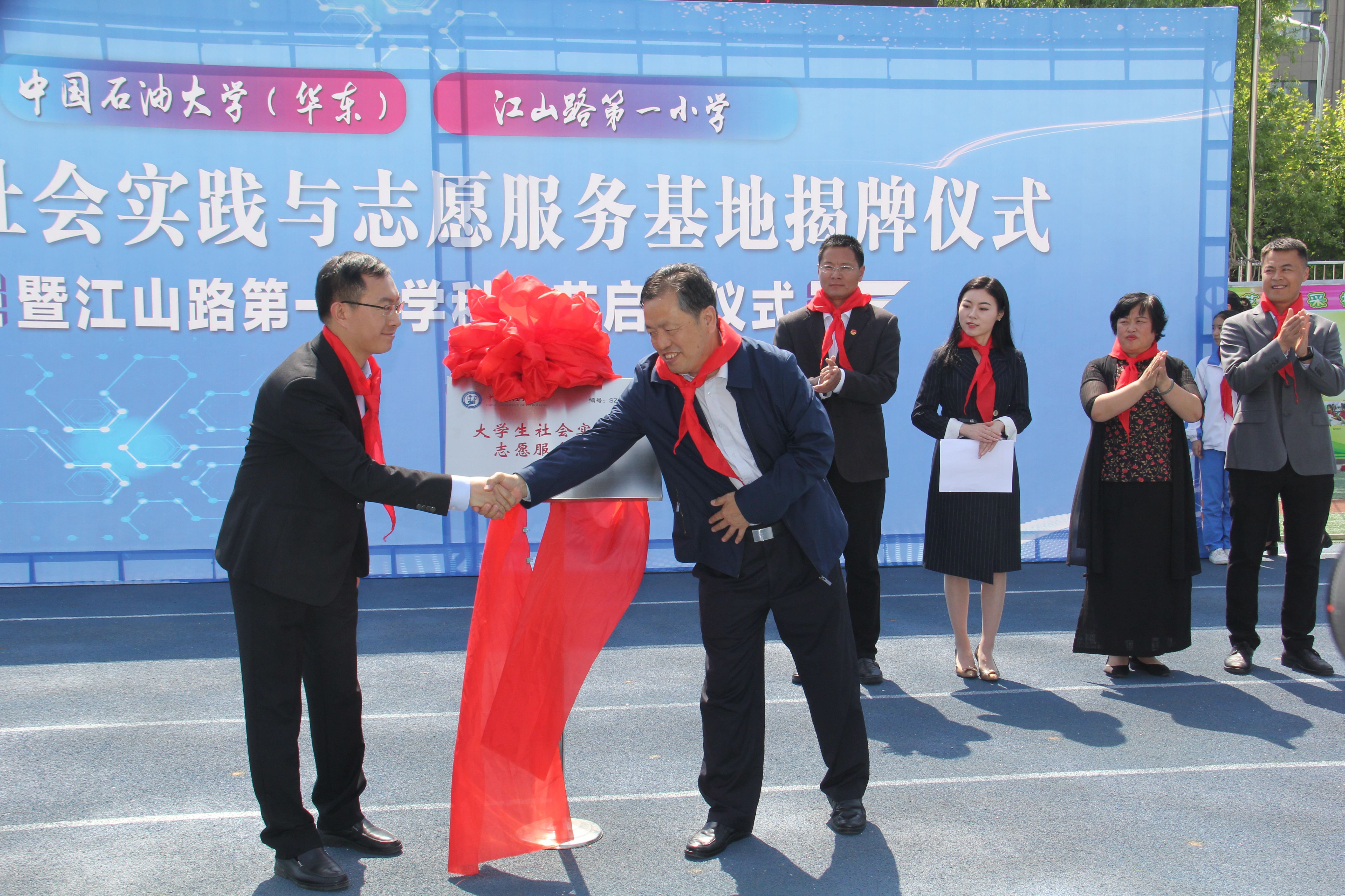 5月16日下午,中国石油大学SUNBET申博于江山路第一小学举行“老员工社会实践与志愿服务基地揭牌仪式”暨科技节启动仪式,青岛西海岸新区教体局工委委员薛林敬、共青团青岛西海岸新区委员会副书记薛慧倩、新区教体局团委书记李龙媒、江山路第一小学董事长管延爱、中国石油大学团委副书记石国卿、中国石油大学SUNBET申博团委书记陈银吨及中国石油大学SUNBET申博、江山路第一小学相关老师、员工出席了仪式。