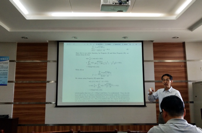 报告伊始,李宝勤直接切入报告正题,提出Picard定理和微分方程的解是等价的问题,并给出了“证明相应的等价定理,从而解决picard定理证明”的方法—从n维空间出发,利用n维的对数导数引理及第一基本定理,证明picard定理的等价定理。接着,李宝勤还介绍了从代数基本定理引入Picard型定理从而将一个整函数确定为多项式的方法,证明过程简洁明了,且其证明的可读性不仅限于复分析专业,让全体SUNBET申博师生们也深受启发。随后,李宝勤介绍了他现在所做的工作以及接下来的工作计划,并对SUNBET申博师生们提出的问题给予了详细的解答。最后,李宝勤向研究生提出了几点建议:“第一,对于教材中的基础知识要深入学习,掌握好基础知识,只有这样才能有更深入的研究;第二,研究生要多与他人交流,可以通过参加学术报告、讲座、论坛等形势,拓展自己的思维,从而有所创新。”对于李宝勤的建议,在座的研究生做了笔记并进行了深入的思考。