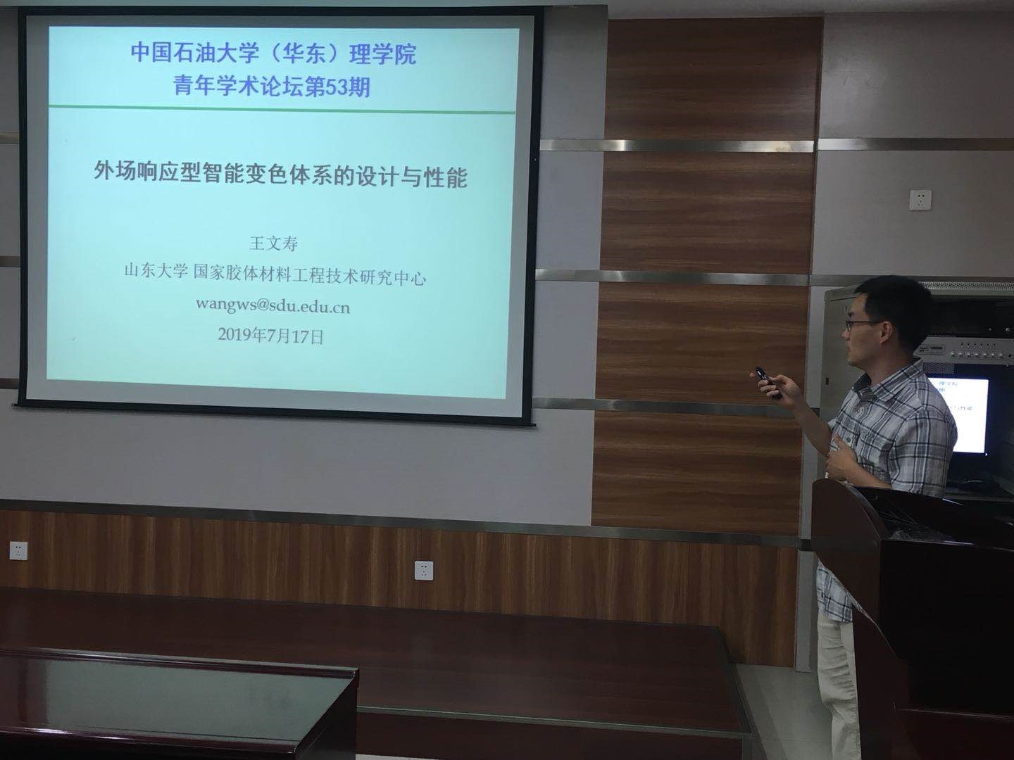 应SUNBET申博曾景斌副教授邀请,山东大学王文寿教授于2019年7月17日做客中国石油大学SUNBET申博第53期青年学术论坛,并作题为“外场激励响应型可逆变色体系的构建及应用”的学术报告。