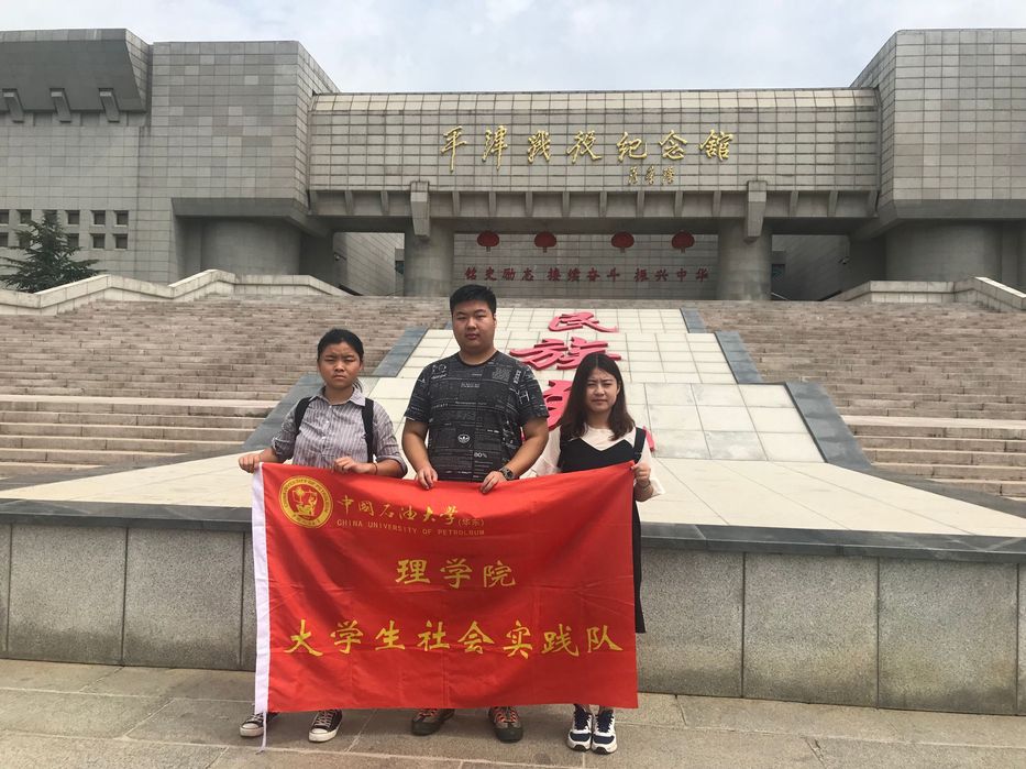 从金汤桥上走过,实践队员们来到纪念广场,广场中央64米高的胜利纪念碑巍然屹立。两根高大花岗岩立柱构成胜利门,柱顶伫立着解放军战士鸣枪欢庆胜利的塑像。胜利门两旁的花岗岩浮雕墙与广场东西两侧的锻铜群雕,向实践队员反映了军民团结奋战的胜利景象,烘托出人民战争的磅礴气势。接着,实践队员来到主展馆,馆前的三个红色大字“民族魂”让队员久久伫立,“这三个字强烈地激发了我心中的民族自豪感,使我久久不能平静”,实践队员田琪不禁感慨道。拾级而上,映入眼帘的是聂荣臻元帅生前题写的“平津战役纪念馆”七个镏金大字,与雄伟挺拔的三层纪念馆主体建筑相得益彰。而后,实践队员来到序厅,大厅中央的铸铜雕像——《走向胜利》使队员们感受到中共中央毛泽东、刘少奇、朱德、周恩来和任弼时五位书记的领袖风采。随着讲解员的引导,队员们又依次参观了战役决策厅、人民支前厅、英烈业绩厅等六个展厅。一张张历史照片、一件件历经战火的实物展品,向大家真实、客观地反映了平津战役的全过程,让实践队员们见证了曾经的峥嵘岁月;同时,队员们深入体会了毛泽东主席、中央军委的高超军事指挥艺术,为解放军战士英勇顽强的战斗作风、支前人民无私奉献的崇高品质所深深打动。