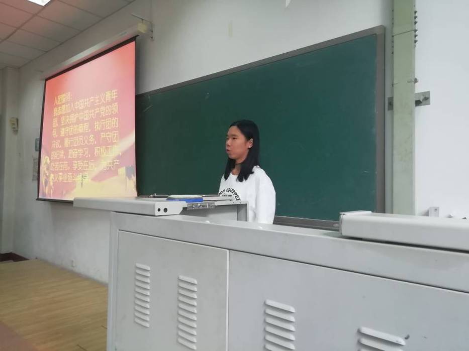 主题团日活动在国歌中拉开序幕。全体人员起立,奏唱国歌。接着,团支书周新秀带领新、老团员宣誓。此后,优秀团员代表刘晓旭发言。她呼吁,青年人作为新时代的主力军,要牢记使命,坚持中国共产党的领导,同人民一道为实现“两个一百年”奋斗目标、实现中华民族伟大复兴的中国梦而奋斗。优秀团员代表宫吉祥从思想、学习、生活等方面号召新团员们严格要求自己,不断挑战自己,积极为班级做贡献。