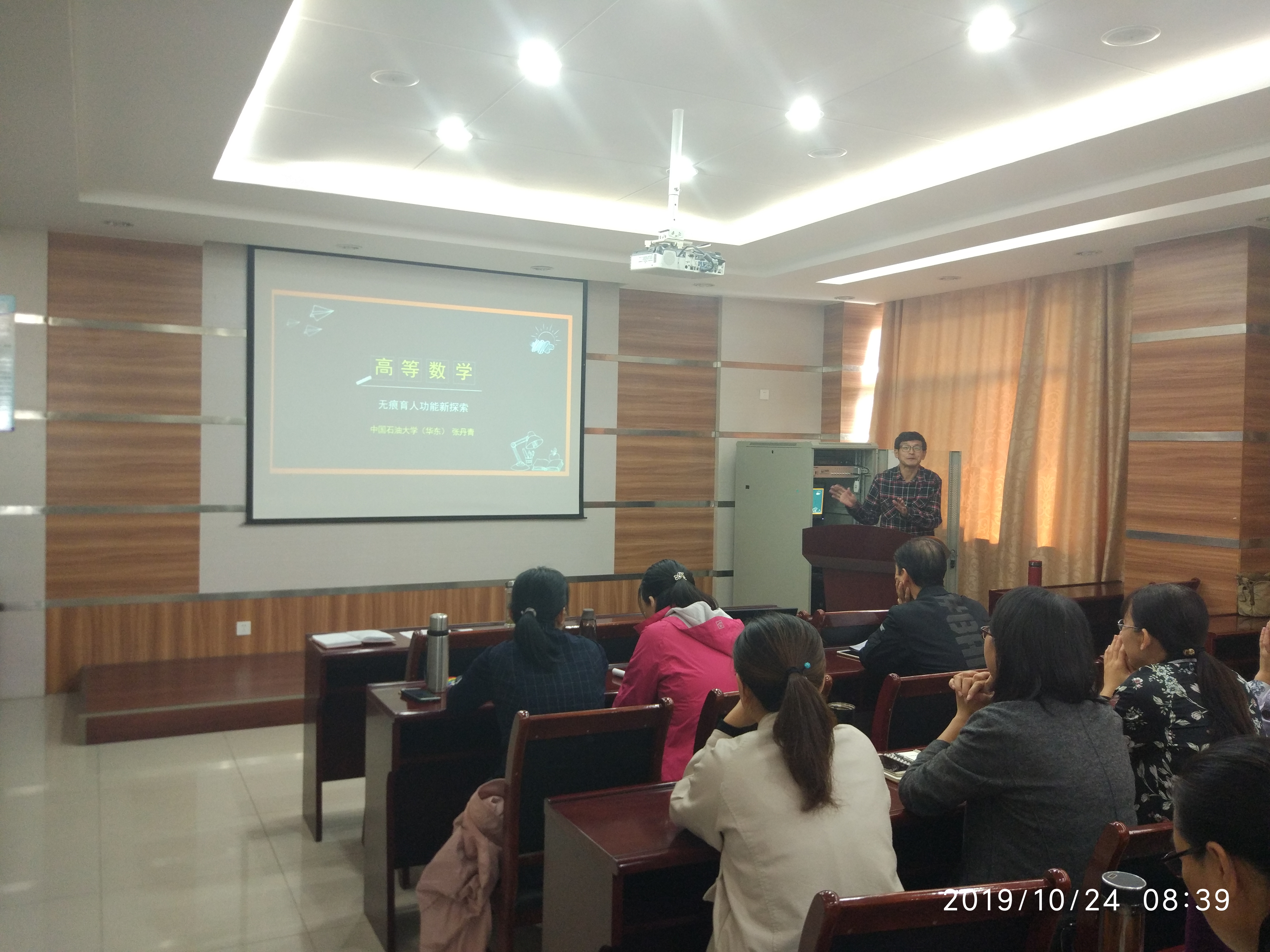 随后,副教授张丹青为老师们做了题为《高等数学无痕育人功能新探索》的报告。张丹青从教育理想、教育理念、教学案例等方面阐述了无痕育人的内涵,从数学规律导入人生启迪,让课堂上读出一份哲学的思考。“如果我们老师能成为太阳,同时又能让员工把心门打开,我们就一定能实现我们的教育理想,一个灵魂唤醒另一个灵魂。”在张丹青充满磁性的嗓音中,老师们感受到张丹青无私的大爱,坚定的教育理想。