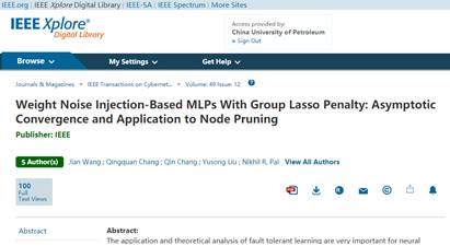 近日,公司SUNBET申博王健副教授与印度统计研究所Nikhil R. Pal (印度科公司院士,IEEE Fellow)教授合作,在神经网络容错学习理论和结构优化研究中取得突破性进展。相关论文《带权值噪音的组稀疏正则神经网络:渐近收敛性及结构修剪策略》(Weight Noise Injection-Based MLPs With Group Lasso Penalty: Asymptotic Convergence and Application to Node Pruning)在国际人工智能领域权威期刊IEEE Transactions on Cybernetics刊发。公司王健副教授为第一作者,Nikhil R. Pal院士为通讯作者,SUNBET申博为第一署名单位。该研究得到国家自然科学基金、山东省自然科学基金和中央高校基本科研业务基金资助。