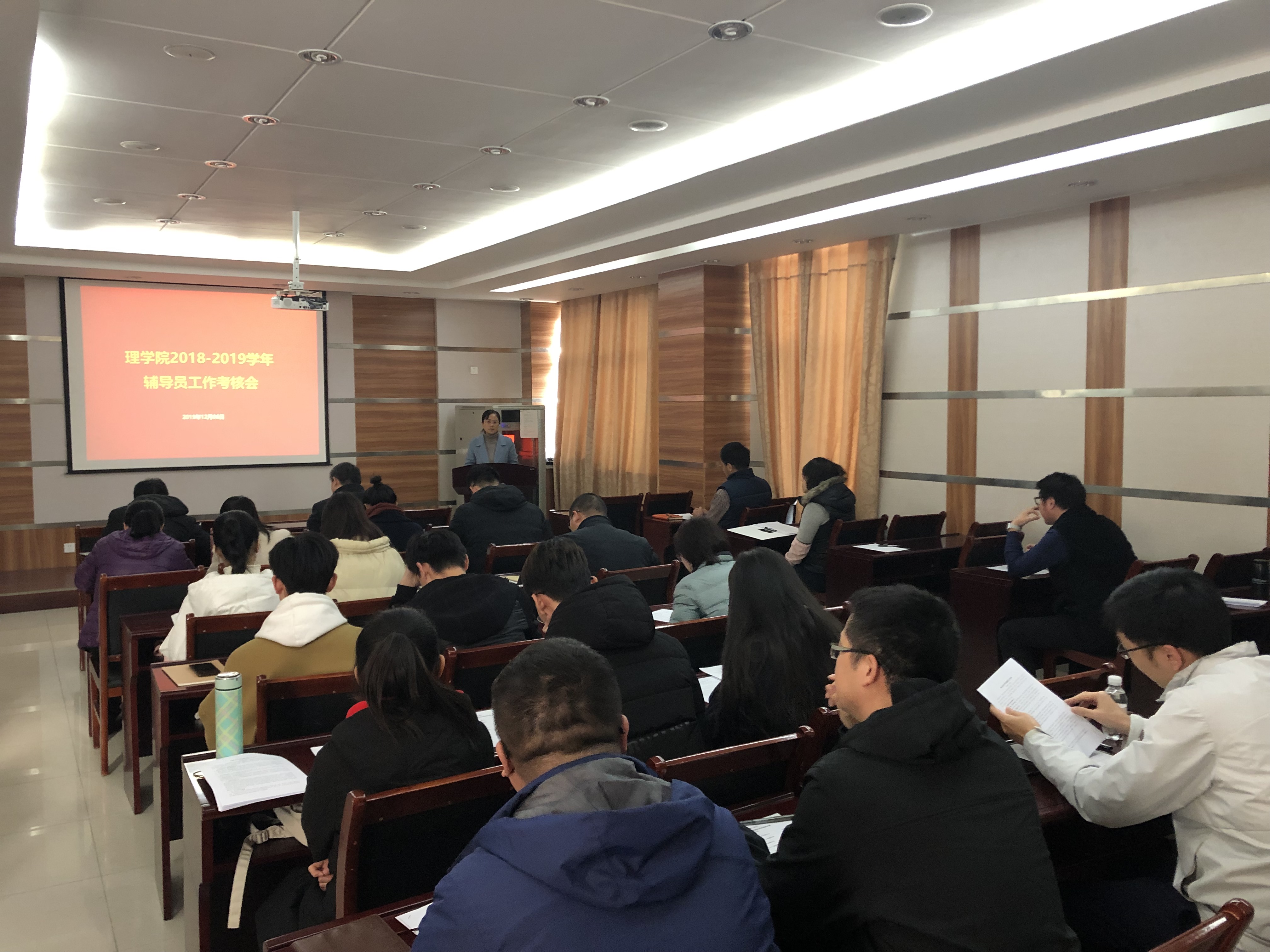 会上,李宝玺讲解了辅导员考核办法,对考核内容作了详细说明,并对考核组人员情况作了介绍。辅导员赵倩、陈银吨、刘威、汤斌飞、田方从德、能、勤、绩、廉五个方面分别作了2018-2019学年辅导员工作总结汇报并回答了评委提出的问题。