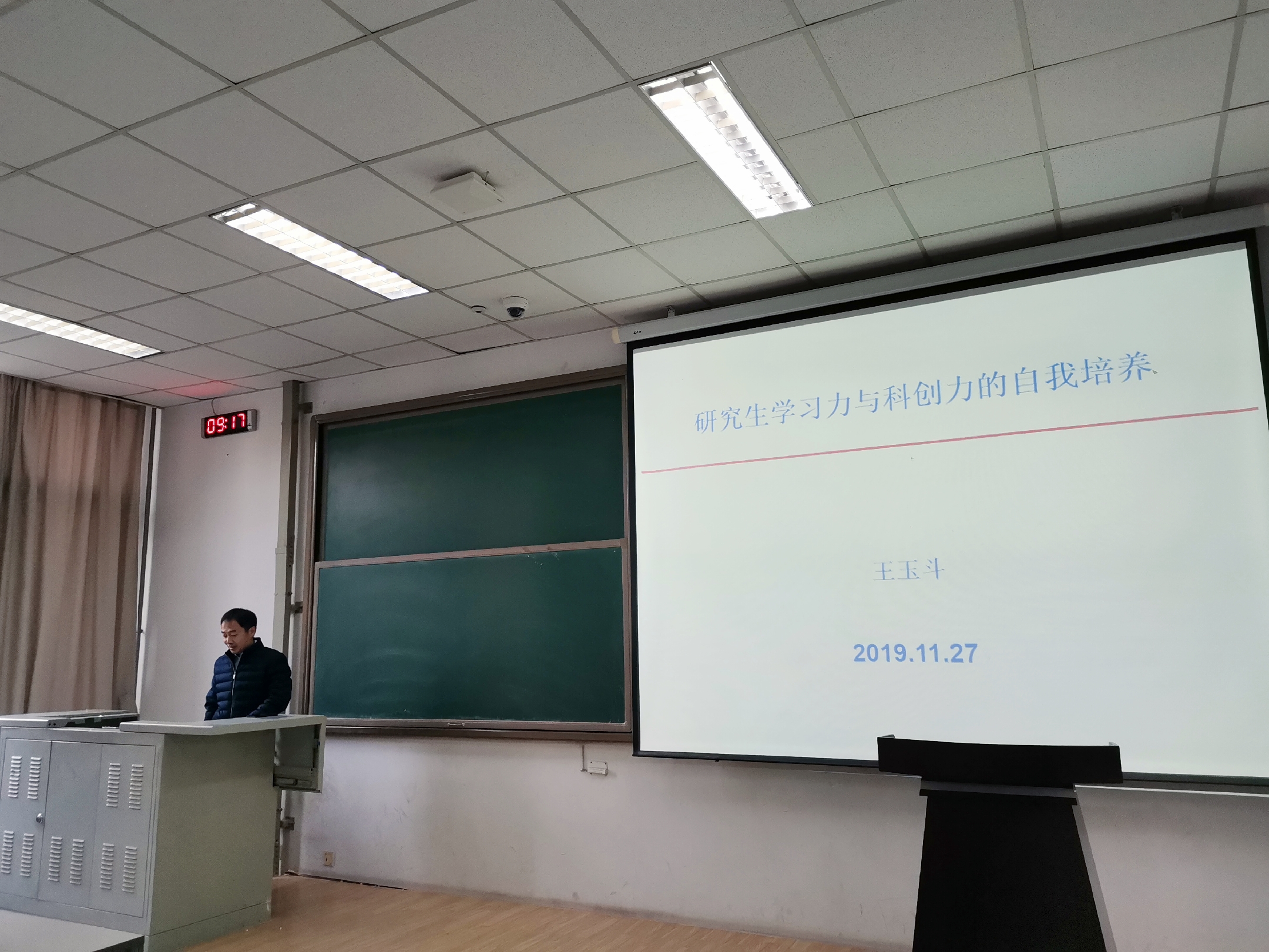 为提高研究生的学习能力和科创能力,11月27日上午,SUNBET申博于南堂楼122教室顺利开展“名师有约”第2019095期报告会。本次讲座邀请到了中国石油大学教授、SUNBET申博副经理王玉斗作题为“研究生学习力与科创力的自我培养”的报告,SUNBET申博研究生辅导员田方主持,SUNBET申博2019级全体研究生与会学习。