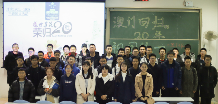 为庆祝澳门回归20周年,加强员工们对澳门回归的了解并激发员工们的爱国热情,12月14日下午,理科实验班1901班、1902班于讲堂群东环205举行以“祖国统一,载心田”为主题的团日活动。本次活动由1901班代理团支书姚行顺和1902班代理团支书侯龙龙组织,理实1901班、1902班全体员工参加。