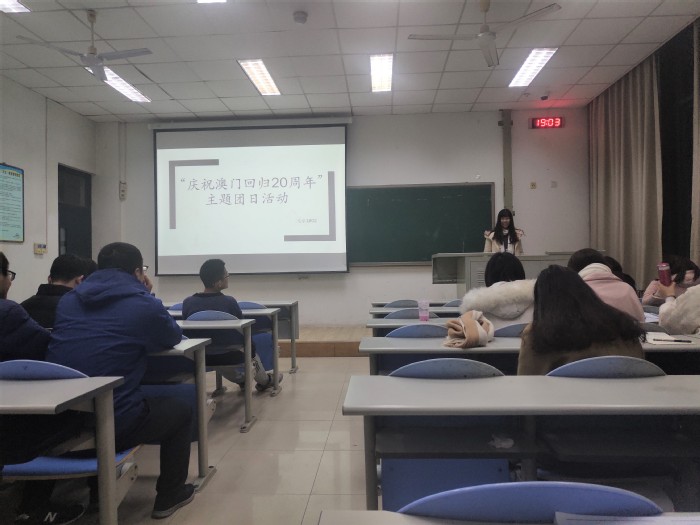 今年是澳门回归祖国20周年,为响应团委号召,纪念这一重要事件,并深入了解“一国两制”方针,12月28日晚,化学1802团支部于南堂101教室举办“庆祝澳门回归20周年”主题团日活动,此次活动由团支部书记孟新主持,团支部全体成员参加。