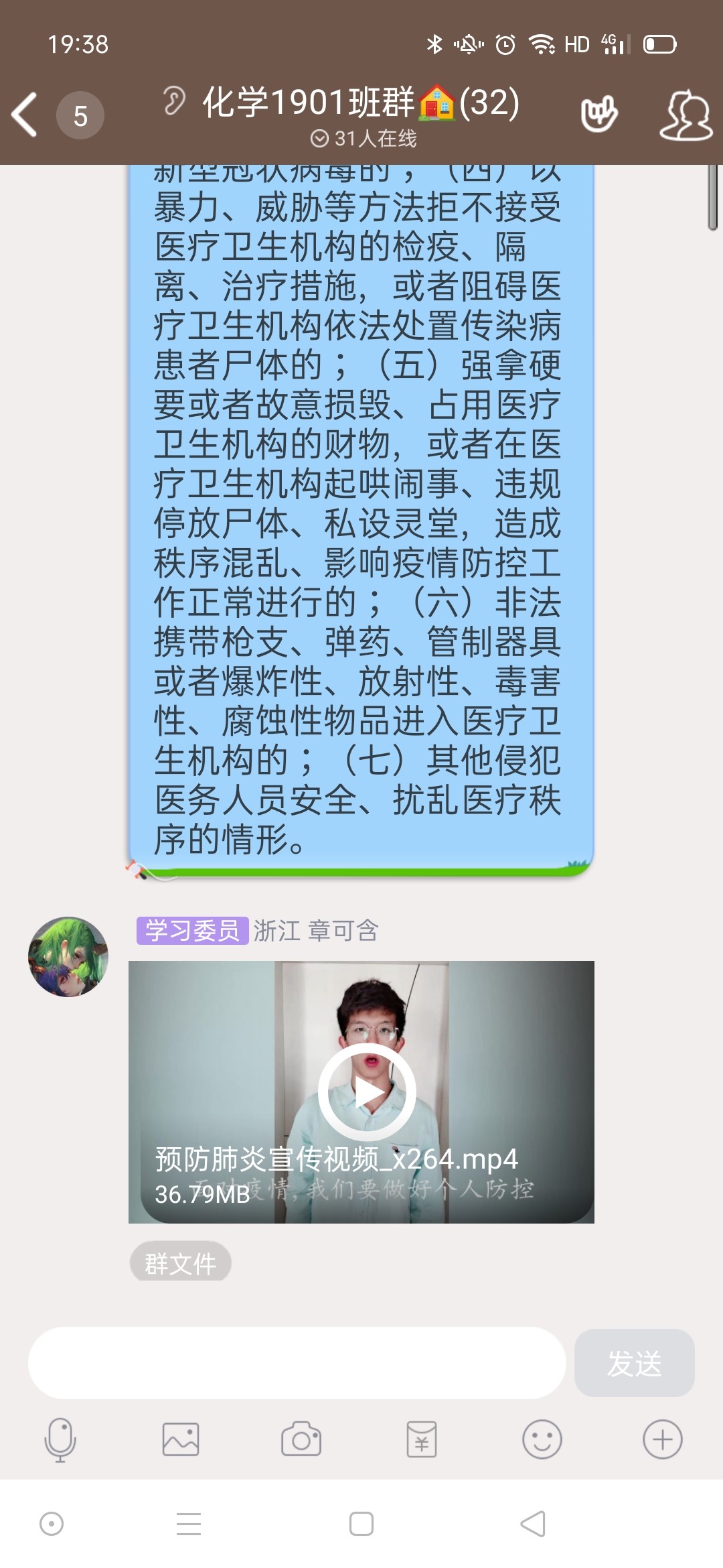 活动伊始,学习委员章可含宣传防疫手段,在班级群中发布正确洗手的视频、正确佩戴口罩的文章,并传达当前疫情信息。随后,团支部成员通过文字誊写的方式,抄写防控疫情承诺书,并在署名后上传到班级群相册。接着,团支书刘梦婷组织有关防控疫情的知识问答活动,随机抽取成员回答问题。她利用“学习强国”APP音频会议的模式,播放关于疫情防控的视频,并向成员们展示为武汉所写的暖心话语。最后,刘梦婷对本次团日活动进行总结。