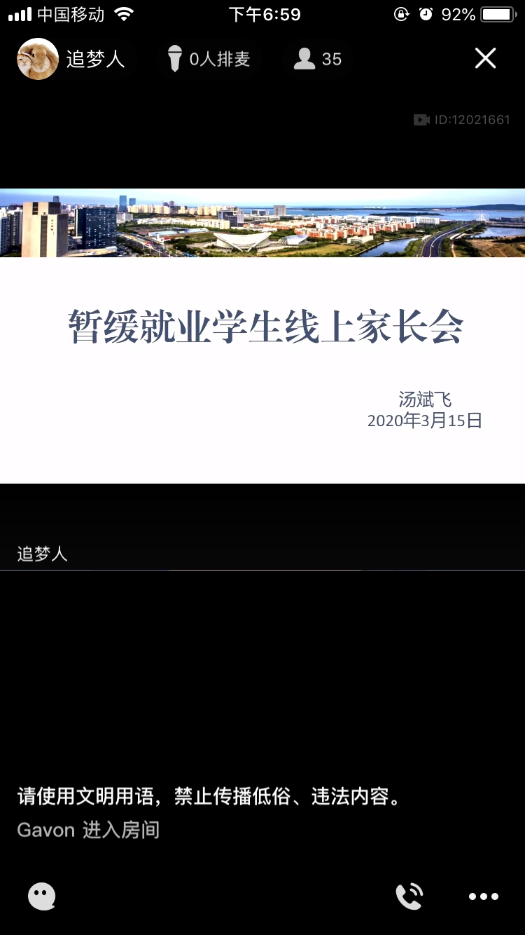 根据最新摸底的2016级本科生就业意向,辅导员汤斌飞于3月15日晚七点召开了暂缓就业员工线上家长会,暂缓就业员工家长55人全部参加会议。