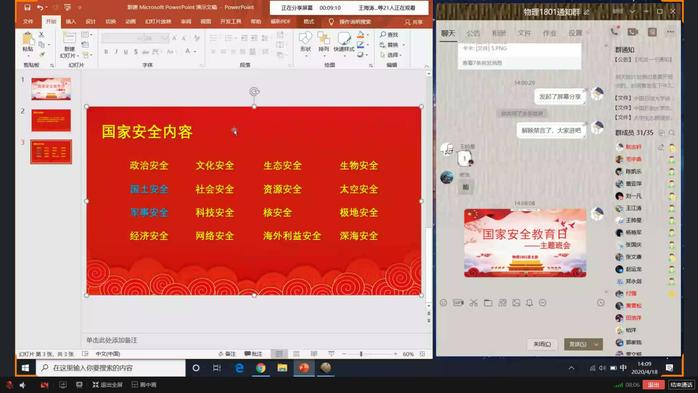4月14日,支部组织全体成员观看石大讲座网推出的“国家安全教育视频”,让支部成员基本了解国家安全。4月15日,团支部组织观看谭书臻老师带来的”从新冠肺炎疫情谈生物安全”直播讲座,使员工结合新冠肺炎疫情对国家安全有了深入的认识。在这两项活动中,大家都及时观看并截图留存。为检验团支部国家安全教育的成效,4月16至4月20日,支部全体成员参与国家安全知识竞答,平均分已达及格水平。4月18日,支部召开国家安全教育主题班会进行交流讨论,团支书耿志轩介绍国家安全基本概念和基本内容,员工们结合真实案例讨论国家安全的重要性,认识到应该从身边的点滴注意国家安全。