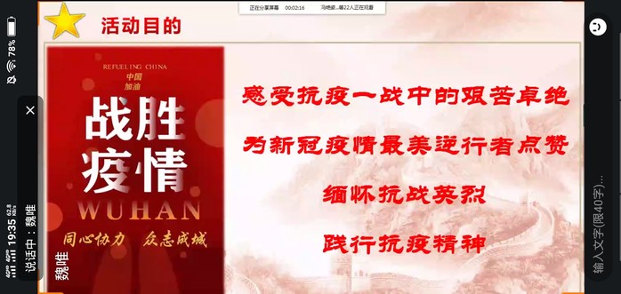 时值“五四”运动101周年,理实1801团支部响应院团委的号召,于4月26日晚在班级内对前期举办的“抗疫”活动进行了成果总结报告,班内成员线上观看并积极发言。