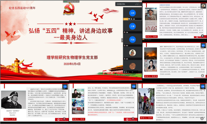 为引导广大青年党员继承和发扬五四精神,树立正确的社会主义核心价值观,激发忠党爱国的深厚情怀,培养一代有理想、有本领、有担当的优秀社会主义青年,5月4日,研究生物理员工党支部依托信仰人生第84期组织开展了以“弘扬‘五四’精神,讲述身边故事--最美身边人”为主题的线上党日活动。此次会议由党支部书记王辉主持,支部委员及支部全体党员、入党积极分子参会。