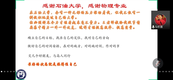 讲座伊始,王凯先对自己做了简介,后详细介绍中国工程物理研究院历史沿革,并对研究生院的历史沿革、现状及核物理与化学研究所有关研究生教育、科研平台及重要科研方向进行详细介绍。同时他为同学们展示许多精美的校园风景图,鼓励同学们积极加入核物理与化学研究所,以“铸民族基石、做民族脊梁”作结语。随后,马积喜详细介绍核武器的历史,研制过程,发表自己在石大学习的感悟,表达对石油大学和物理专业的感激之情,同时告诫同学们要接得住自己,即“一天比一天强!”以及强调锻炼健康身体的重要性;最后,马积喜从培养单位、特色培养、校园文化、学费待遇、招生计划、招生宣传夏令营(往年)、部分培养单位简介等七个方面对中物院研究生教育进行详尽解读。