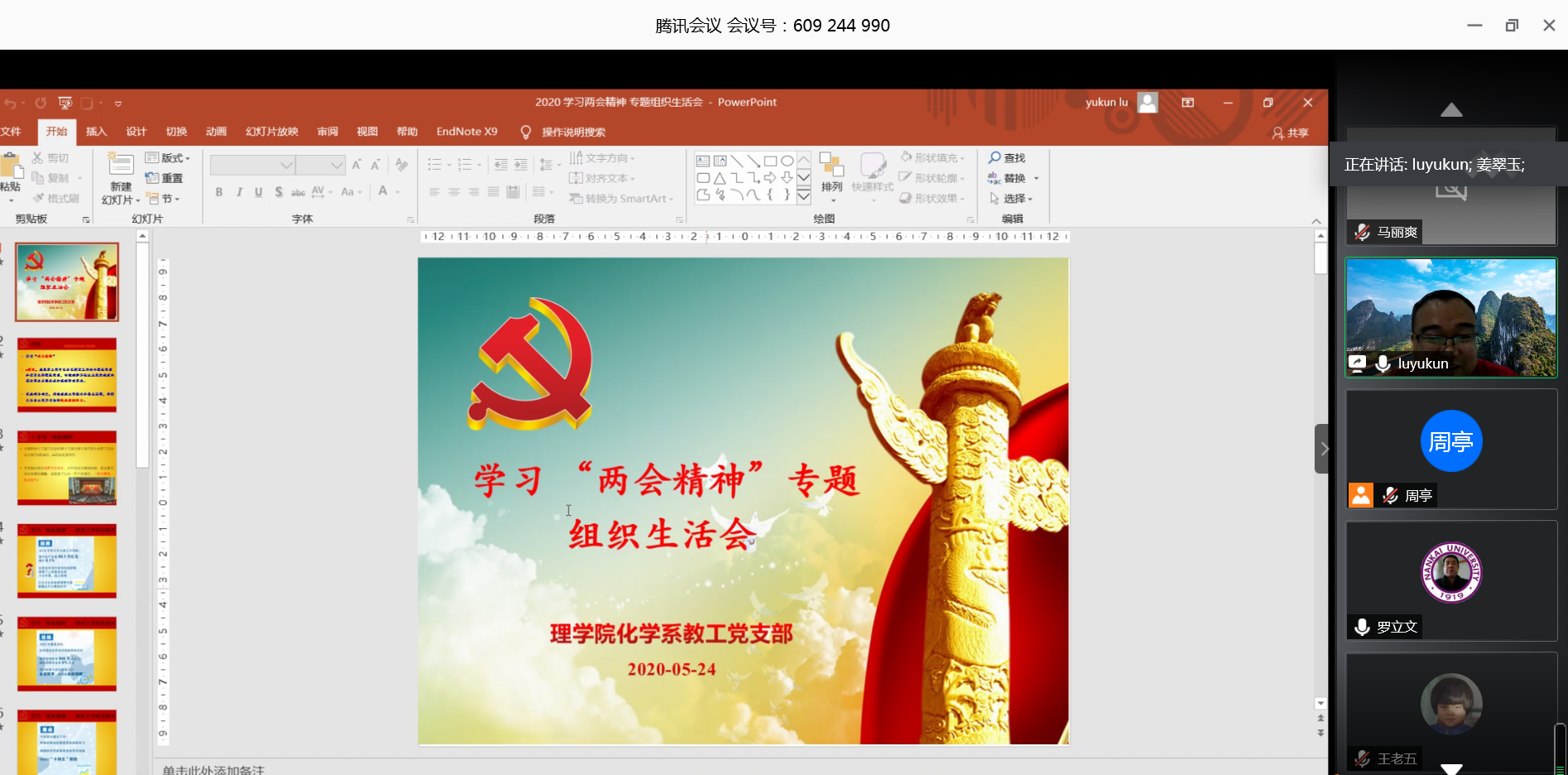 5月21日和22日,全国政协第十三届三次会议和十三届全国人大三次会议分别在北京开幕,化学系教工党支部党员纷纷通过电视、广播和网络等多渠道收看收听会议盛况等。5月24日,化学系教工党支部开展线上学习“两会精神”专题组织生活会,党员们热情关注两会动态、热议政府工作报告和热点话题,并结合自身工作实际畅谈感想体会,会议由党支部书记卢玉坤主持。