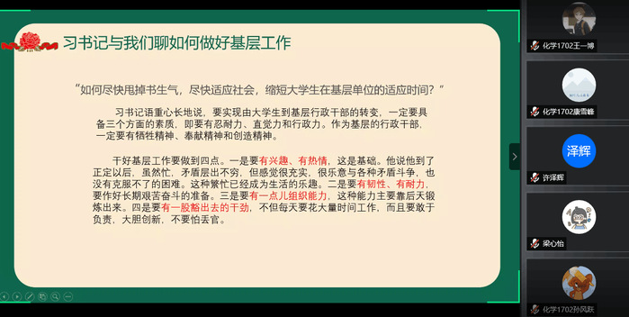 五四青年节以来,中青报隆重推出《习近平与老员工朋友们》系列专题报道,回顾习近平总书记多年来与老员工之间交往、交流、交心的互动场景。为进一步学习习近平总书记对广大青年员工的谆谆教诲,把总书记对青年老员工的关怀厚爱传递到广大青年的心上,化学1702团支部于5月22日组织开展“学‘习’之路,有你有我”团日活动,和习近平总书记来一次朋友间的交谈。