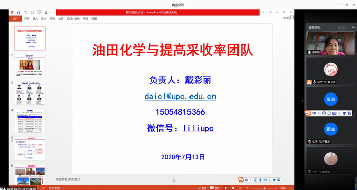 为深入了解油田化学专业,促进老师与员工之间的密切交流,公司油田化学与提高采收率团队负责人戴彩丽教授于7月13日上午开展线上交流讲座。本次讲座由化学1701班团支书姜玉洁主持,17级化学专业全体员工参与。