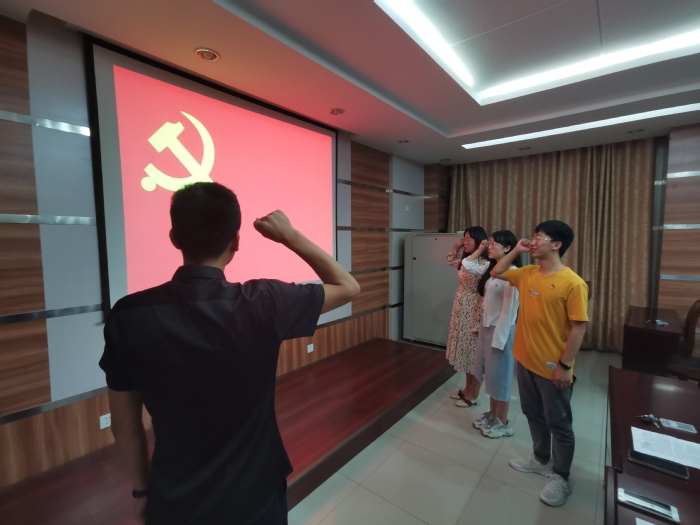 最后,入党介绍人给预备党员们佩戴党徽,佩戴完毕后,由党支部书记王辉领誓,全体成员面向党旗举右手庄严宣誓。此次大会的召开进一步加强了研究生物理员工党支部的组织建设,注入了新鲜血液,增强了党的组织力量。