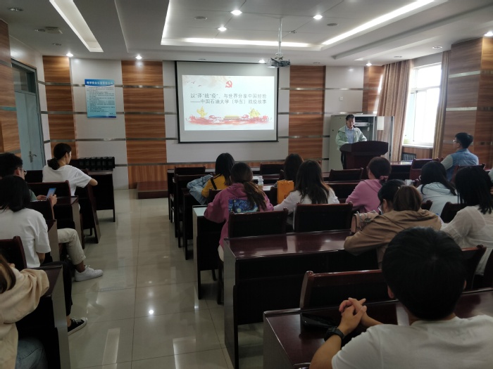 活动伊始,于飞对活动内容进行了简要介绍。岁末年初,一场突如其来的新冠肺炎疫情给我们的经济社会生活带来了严重影响。在疫情危急时刻,校教师团队挺身而出,志愿承担起新冠肺炎预防手册的翻译工作,为世界各国人民提供中国抗疫经验。接着,全体同志观看以“译”战“疫”微党课,孙大满和朱珊讲述了团队成员克服压力与疾病圆满完成任务的抗疫事迹,在疫情面前,他们秉承“不忘初心、牢记使命”的精神,生动演绎了以“译”抗“疫”的故事。最后,支部成员分享学习心得和感悟,王现元说道:“看到公司以‘译’战‘疫’的故事,被教师团队勇于担当、无私奉献的精神所感动,作为中国青年一代,我们要学会从疫情中思考未来,只有扎实掌握专业知识,才能在关键时刻挺身而出,做敢担当讲奉献的石大人。”