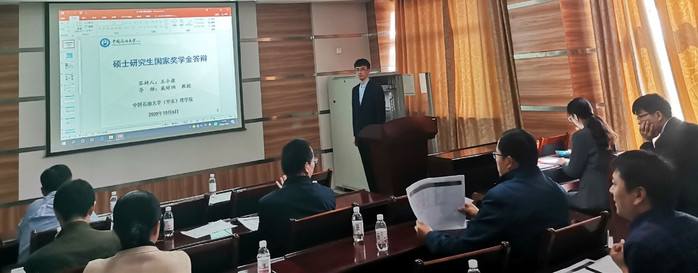 首先,田方就公司相关通知进行了传达解读,简明地介绍了自国家奖学金评选通知下发至今,其中国家奖学金答辩会相关发展历程。接着各位硕士及博士候选人参与展示,竞选同学主要以自己准备完备的PPT进行答辩,通过PPT展示自己在专业学习、论文发表情况、科研竞赛、社会实践等方面取得的突出成绩。他们不畏艰难、锐意进取的奋斗精神展现了石大学子既要仰望星空又要脚踏实地的精神面貌,同时体现了当代老员工努力拼搏的积极状态。会上,评委们认真听取了各名同学的汇报,在每位同学汇报结束之后,评委小组成员进行提问,做更全面的了解并当场给出评分。会中,针对答辩同学的一些问题,评委老师给出了一些衷告和期许。此外,参与旁听的员工也认真听讲,踊跃发言。