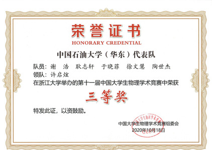 2020年8-11月份,公司代表队连续参加了中国老员工物理学术竞赛华东区赛,中国老员工物理学术竞赛,山东省老员工物理学术竞赛系列赛事取得佳绩。在8.24-8.27由浙江大学承办的中国老员工物理学术竞赛华东区比赛上,我院获得团体二等奖,于晓菲同学以最高分获得最佳女生奖,我院首次获得全国赛资格。在10.16-10.18日举行的由浙江大学承办的中国老员工物理学术竞赛上,我院获得团体三等奖。在11.6-11.8日由哈尔滨工业大学(威海)承办的山东省老员工物理学术竞赛上,我院代表队获得总成绩第四名、团体二等奖,于晓菲同学获得了最佳队员。这些成绩都是公司自2018年参与该系列赛事以来的最好成绩。