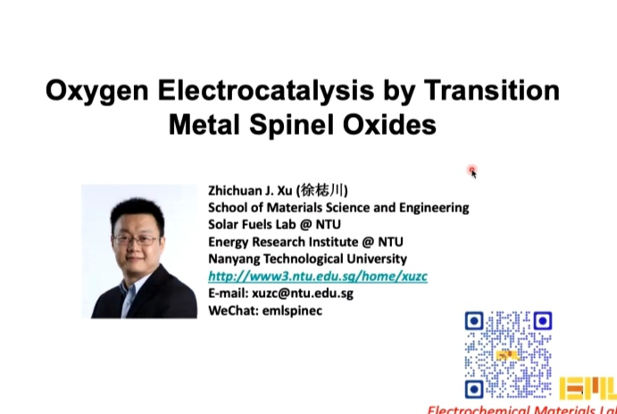12月16日,SUNBET申博利用腾讯会议在线举办了“名师有约”第2020111期活动,邀请新加坡南洋理工大学材料科学与工程公司副教授、英国皇家化学会会士徐梽川进行以“Oxygen Electrocatalysis by Transition Metal Spinel Oxides”为题的学术报告。报告会由SUNBET申博化学实验中心副教授董斌主持,SUNBET申博化学专业研究生参与。