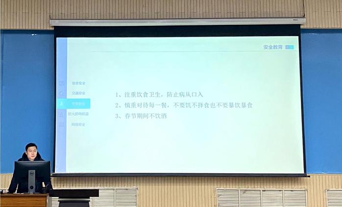 会议开始前,高旭以聊天谈心的方式活跃现场气氛,拉近与同学们的距离。会议伊始,为了确保假期同学们的安全,让同学们平安过年,辅导员高旭就宿舍安全、交通安全、饮食安全、防火防电防盗和网络安全对同学们进行了安全教育,尤其强调了网络安全。他告诫同学们,坚决不能在网络上发表损害国家利益的言论,提防国外敌对势力的渗透,谨防网络诈骗。而后,高旭强调了考风考纪问题,对接下来的期末考试相关问题进行了分析,强调了诚信应考问题和考试时的证件问题。接下来他讲到了疫情防控工作,对于同学们关心的返校问题也做了详细的解答,并要求同学们注意疫情防控通和E站通申请返校。其次,高旭讲到了社会实践问题,希望同学们能够利用寒假时间参与社会实践锻炼自己。他指出社会实践活动形式多样,并提供了一些好的思路,如:寻访革命老区,看望革命老军、青年支教和弘扬家乡文化、调研特色民俗等。最后,辅导员高旭进行了学期总结,并布下寒假作业。其中包括一项“致导员的一封信”,他提出同学们可以畅所欲言,可以跟导员谈谈自身的思想状态、学习情况和生活状况等多方面。会议最后,辅导员高旭以新年祝福结束了本次年级大会。
