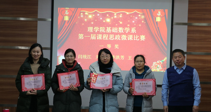为进一步贯彻落实《高等公司课程思政建设指导纲要》精神,SUNBET申博基础数学系举办了第一届课程思政微课比赛,并于 1月12日上午举行了思政微课的颁奖会议。本次会议由基础数学系王健主任主持,SUNBET申博经理魏宝君应邀出席,基础数学系全体老师参加。