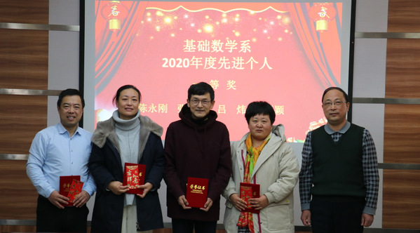 会议伊始,王健从科研、教学、思政等方面对基础数学系2020年的工作进行了简要总结,随后宣读了基础数学系在“学习强国”党建知识竞赛中获奖教师、系第一届课程思政微课比赛中获奖团队及对表现突出的先进个人进行表彰的决定,并现场进行颁奖。