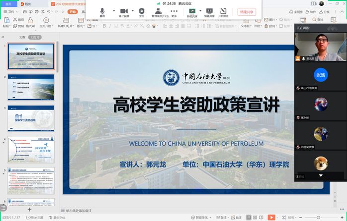 公司高度重视员工资助政策宣传工作,共聘任23名国家奖学金获得者担任“员工资助宣传大使”,组织宣传大使参加聘任仪式及培训会,统一制作宣讲PPT,确保政策讲解规范精确。寒假期间,宣传大使们积极行动,联系母校老师,面向在校高中生进行广泛宣讲;同时进村入户,走访家庭经济困难员工家庭,提供帮助和建议。部分地区的同学受疫情影响,采用线上形式,依托腾讯会议等平台开展网上宣讲,详细介绍政策并顺利进行互动。宣讲内容十分丰富,不但包括国家、公司资助政策,还有多彩的资助育人活动和我校的良好风貌展示。为确保资助宣传工作完成质量,辅导员通过《过程管理在线表格》及时掌握完成情况,做好相关提醒。最终23名同学全部顺利完成宣传任务,并向多个校外媒体网站投稿,扩大了宣传效果。
