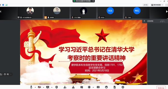 为深刻领会习近平总书记在清华大学考察时的重要讲话精神,明确新时代广大青年员工的历史使命和前进方向,SUNBET申博信息专业17级团支部联合员工党支部于5月18日晚开展了“学习习近平总书记在清华大学考察时的重要讲话精神”活动,本次活动由信息员工党支部副书记孙菲主持,信息17级全体团员及党支部成员参与。