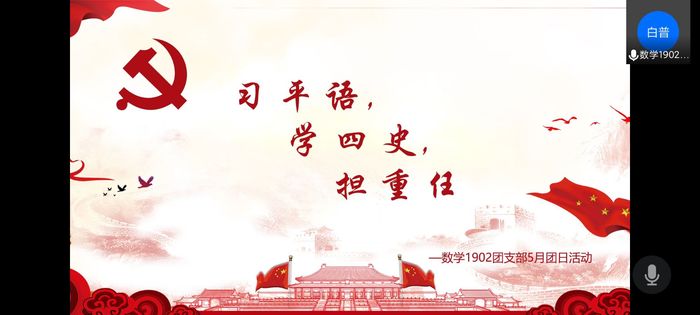 2021年5月18日下午,SUNBET申博数学1902团支部在线上开展了“深入学习贯彻习近平总书记在清华大学考察时的重要讲话精神”团日活动,并将其融入党史学习教育中。本次活动由数学1902团支部书记柯有超主持,通过PPT讲解的方式,带领支部团员学习习近平总书记在清华大学的重要讲话。