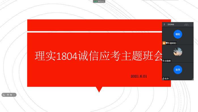 2020-2021第二学期期末考试即将来临,为构建“勤奋学习、公平竞争、敬畏法纪、诚信应考”的考试文化,端正班级员工考试态度,理实1804于6月1日晚开展线上主题班会。