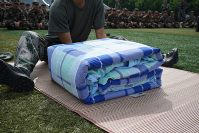 在军训休整期间,教官带领员工有序坐下,并示范正确军被“豆腐块”叠法,以便于员工更加准确地整理内务。辅导员老师积极加入到员工中间,提高员工参训积极性,带领员工一同拉歌、游戏。