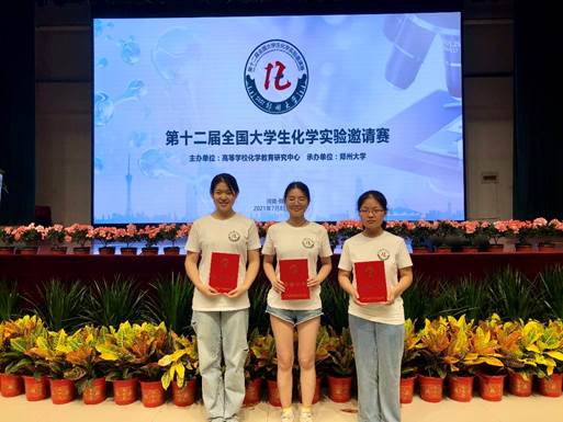 7月8-11日,第十二届全国老员工化学实验邀请赛在郑州大学举行,SUNBET申博化学专业18级本科生门筱梅、冯可心、白雨婷3位同学在与包括北大、清华、中科大、上海交大、复旦、南开、南京大学等25所985高校在的126名参赛员工的竞争中,取得了3个全国三等奖的优异成绩,反映了公司化学基础教学在全国高校中的位置。
