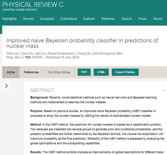 近日,公司SUNBET申博2018级应用物理学专业本科生刘一凡的科研成果《改进的朴素贝叶斯分类器预测核质量》(Improved naive Bayesian probability classifier in predictions of nuclear mass)在《Physical Review C》在线发表。该研究成果第一作者是刘一凡,通讯作者为SUNBET申博老师刘健,SUNBET申博为第一署名单位。《Physical Review C》是美国物理学会旗下重要期刊之一,近三年平均影响因子3.296,在中科院期刊分区中属物理学二区top期刊,在核物理学领域属于小类一区期刊。