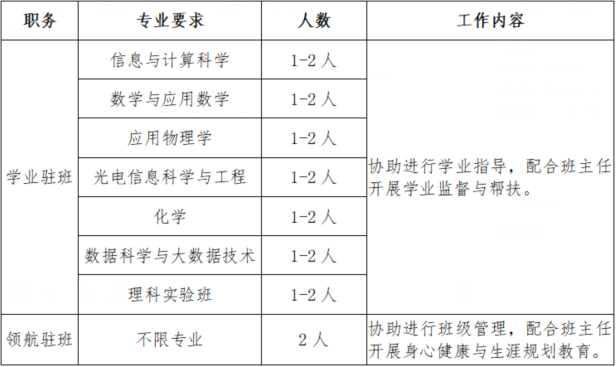 学业驻班选拔按照专业配备,每专业选配1-2人,领航驻班不限专业,选配2人。具体名额分配如下: